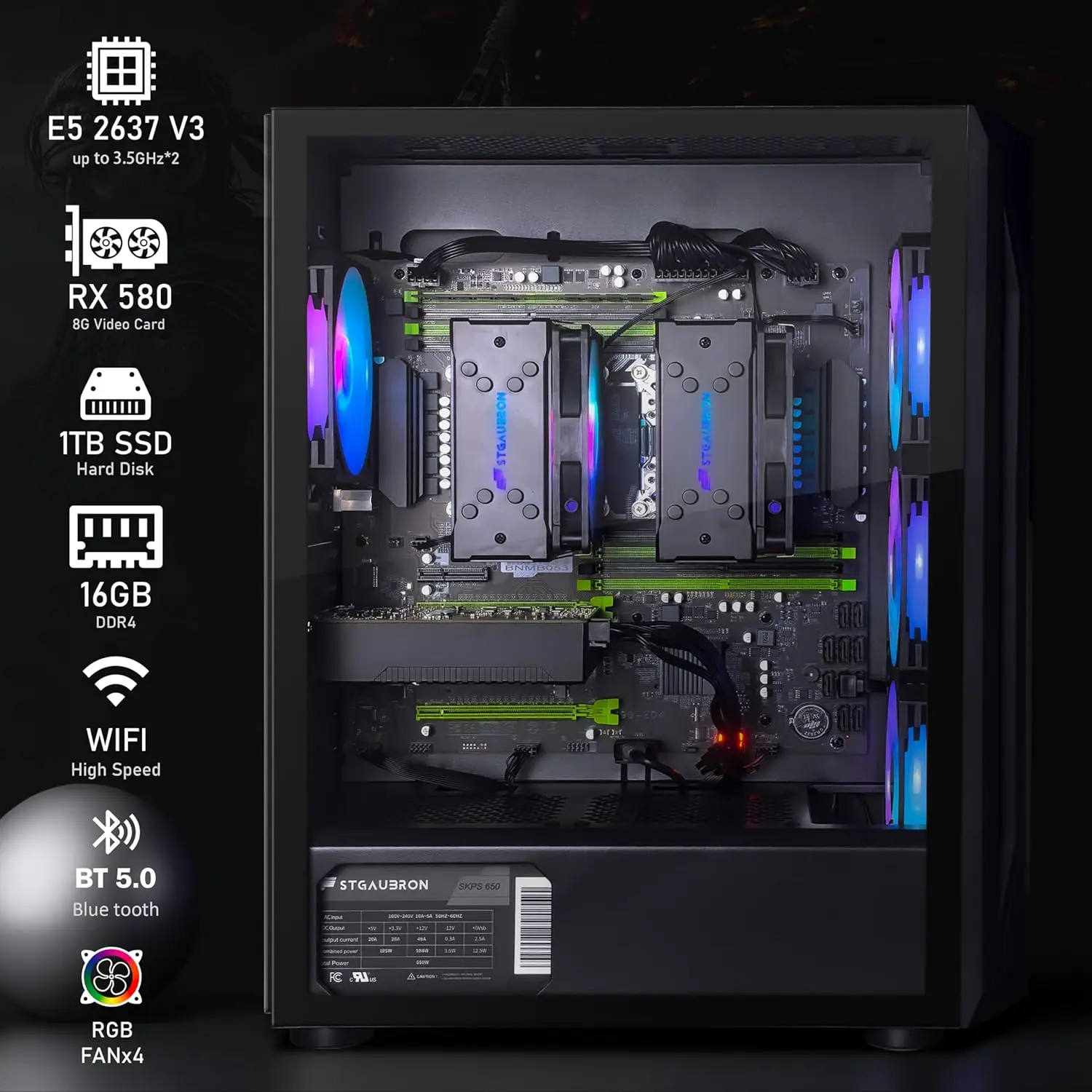 Gaming PC Computer Desktop, Radeon RX 580 8G,Dual Intel I7 Xeon E5 up to 3.7GHz,16G DDR4 Ram,1T SSD,600M WiFi, BT 5.0,RGB Fan x4