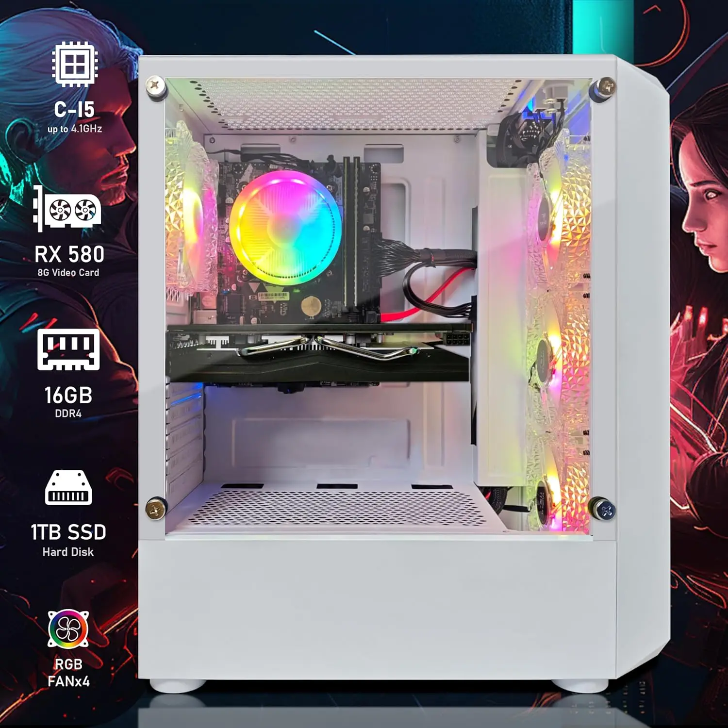 Connectivity: RGB Fan x 4 | 1x RJ-45 | 600M Wi-Fi | USB Bluetooth 5.0 | AMD Radeon RX 580 8G GDDR5 Video Card | 1x HDMI | 3x DisplayPort