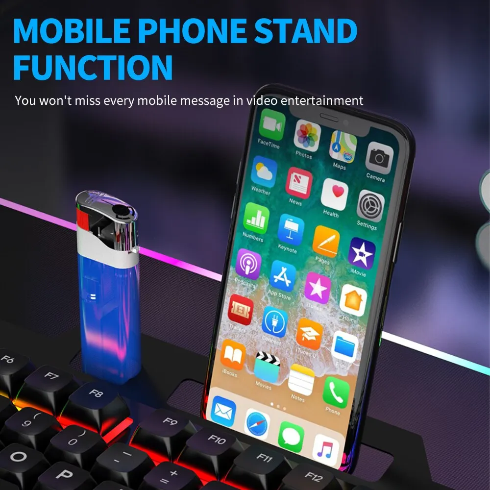There are multiple storage brackets like the pen/lighter/phone holder on the keyboard to make your desktop more tidy, and the mobile phone holder can realize playing game and chatting at the same time. It can perfectly solve the problem of placing the mobile phone during the game.