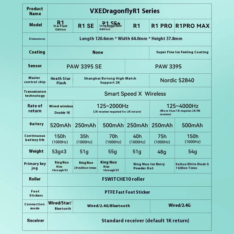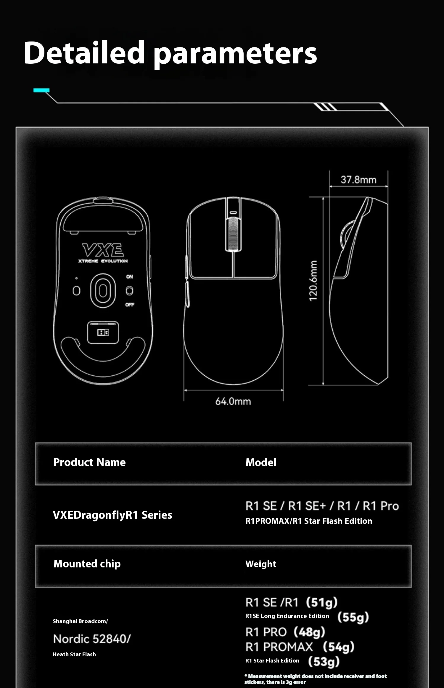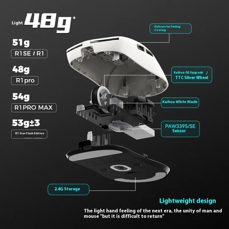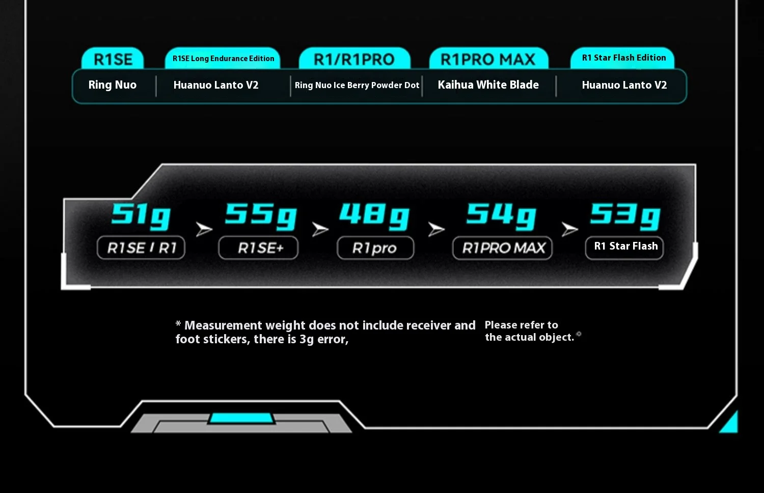 Weight: R1 SE/R1 (51g)/R1 PRO (48g)/R1 PROMAX (54g)